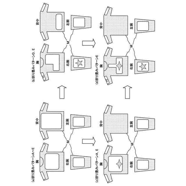 一実施の形態における折り畳みパターンA~Eの被印刷材を示す説明図である。