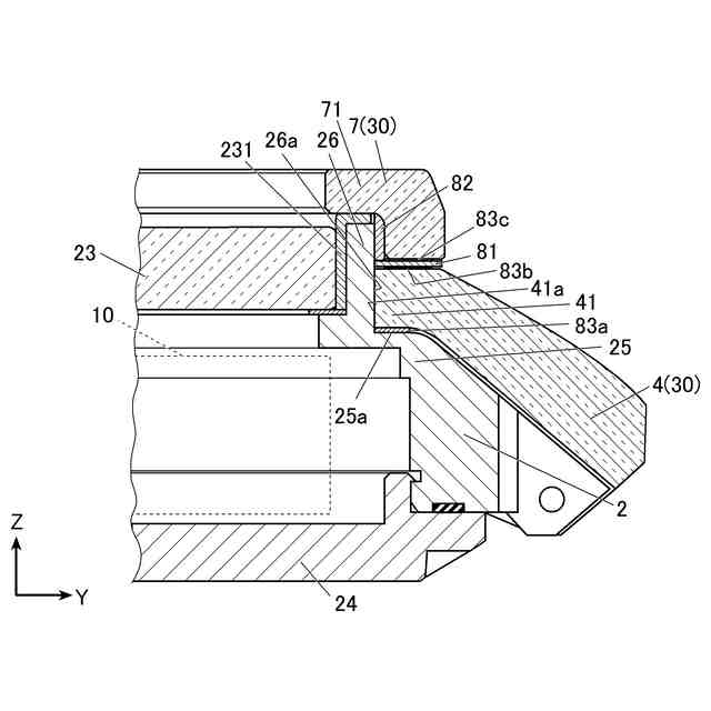 図2及び図3に示すように、時計ケース2の外側面には、上側から下側に向かって段階的に外径側に位置する段付き部25が、略全周に亘って形成されている。段付き部25は、Z方向に略直交して上側を向いた段面25aを有する。時計ケース2のうち段付き部25よりも上側の部分は、上面視で角丸四角筒状の筒状部26となっている。筒状部26の内径側には、第1パッキン231を介して風防部材23が嵌合されている。