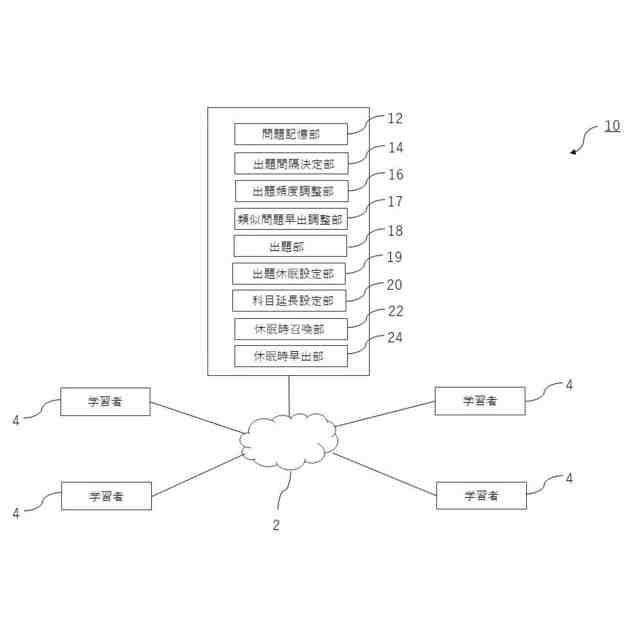 前記出題休眠設定部に基づいて休止設定された前記学習の必要性が低い問題の出題を休止しつつ、前記出題間隔決定部により決定された前記出題間隔に基づいて前記学習者に前記各問題を出題する出題部と、