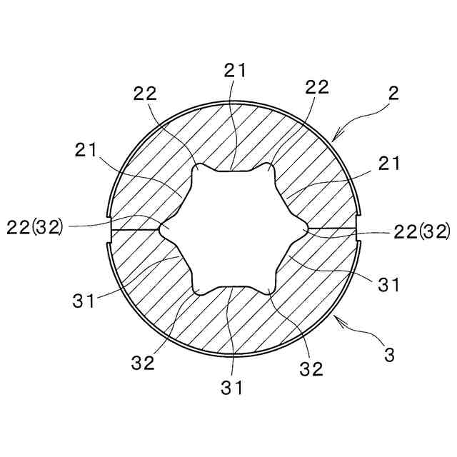図1~3に本発明に係る鉄筋の接合構造を示す。この鉄筋の接合構造においては、鋼管スリーブ1に、両端から突き合わせ挿入された鉄筋10同士が、圧着された鋼管スリーブ1内で接合されている。圧着された鋼管スリーブ1は、周方向に60°ごとに、交互に、軸線方向に所定長を有する肉厚の陵部11と肉薄の谷部12とを備える。陵部11と谷部12の外周は、互いに曲面をもって連続しており、図3に示すように、断面六角星形状を呈する概略形状である。鋼管スリーブ1の内周は、鉄筋10の外周に、ふし10aの底まで密着している。