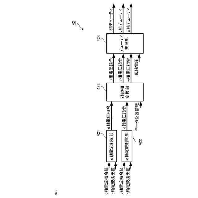 上記のようなインバータは、外部より母線電圧を供給して電動機を駆動する。3相インバータの代表的な制御方式は3相変調方式であるが、スイッチング損失の低減および電圧利用率の向上のため、3相のうち1相を固定相とする2相変調がある。2相変調方式は、u、v、wの各相で上アームがオン状態、下アームがオフ状態、またはその逆の状態でスイッチング相が固定する状態を繰り返し、3相インバータのうち一つの相をスイッチング固定相とする変調方式である。
