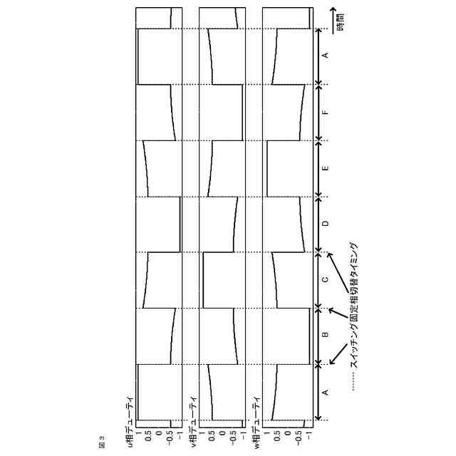 このような課題の対策として、2相変調方式のスイッチング固定相切替前後に3相変調方式を用いる事で、スイッチング固定相切替時母線電圧の急峻な変化を抑制する方法がある。