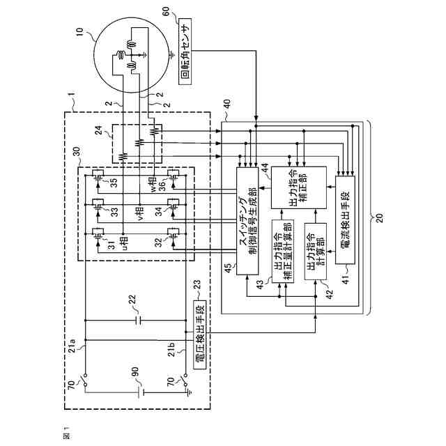 インバータ回路は、複数の半導体スイッチをあらかじめ定めたスイッチング周波数でオンオフすることにより、直流電源の直流電力をあらかじめ定めた交流電力に変換して、負荷である交流電動機のトルクおよび回転速度を調節する。また、交流電動機は、動作状況によっては発電機として動作し、発電によって生じた回生電力を直流電源に充電する。なお、電気自動車に適用される交流電動機としては、効率の良い永久磁石3相同期電動機がよく用いられる。