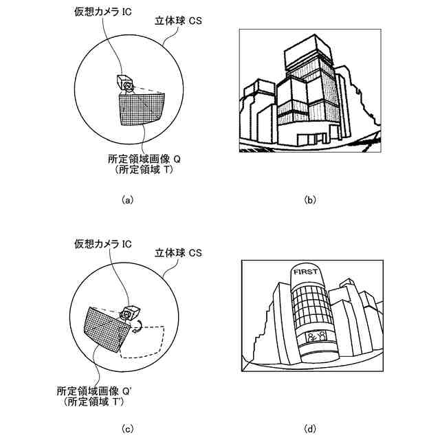 (a)は図5の立体斜視図、(b)は(a)の状態の所定領域画像がディスプレイに表示されている図、(c)は(a)における仮想カメラICの視点を変更後の所定領域を示した図、(d)は(c)の状態の所定領域画像がディスプレイに表示されている図である。