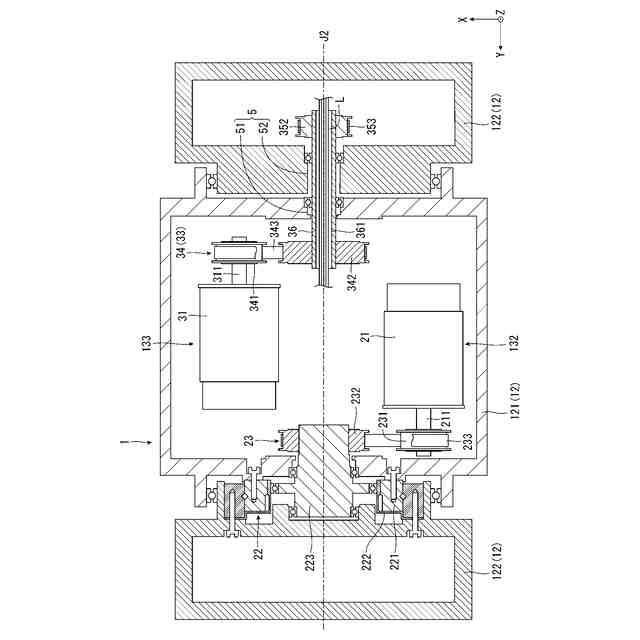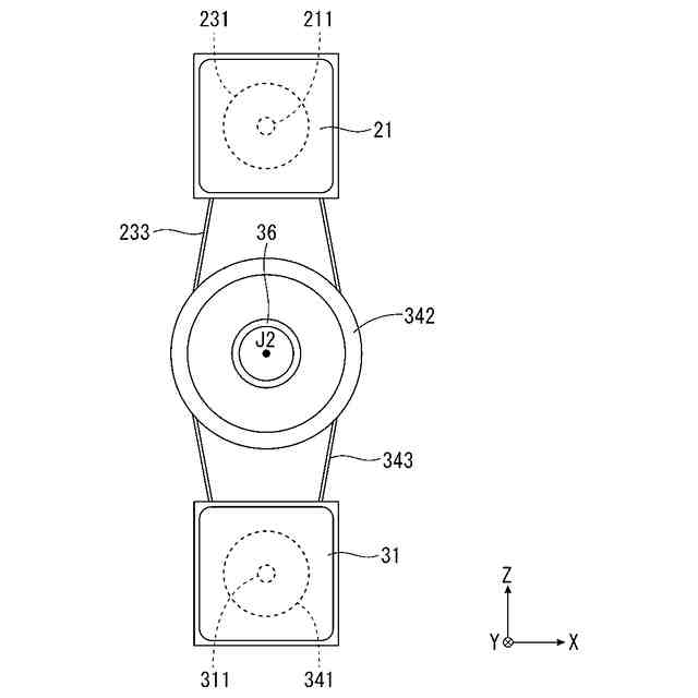 前記第1アーム内に配置されている第1伝達機構と、前記第2アーム内に配置されている第2伝達機構と、を有し、