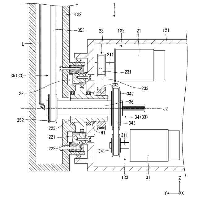 前記第1減速機には、前記第1水平軸に沿い、前記第1アーム内と前記第2アーム内とを連通する貫通孔が設けられ、
