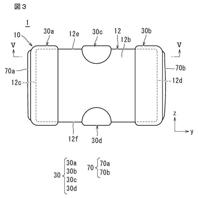 例えば、高速で動作する集積回路部品(IC)に供給される電源電圧を安定化するために用いられるデカップリングコンデンサや、集積回路部品(IC)に供給される電源ラインのノイズ対策部品として、貫通型3端子コンデンサが知られている。貫通型3端子コンデンサは、一般的に、互いに対向する第1の主面および第2の主面、互いに対向する第5の面および第6の面ならびに互いに対向する第3の面および第4の面を有する積層体を備える。積層体の内部には、複数の第1の内部電極層および第2の内部電極層が積層方向において交互に配置されている。そして、第1の内部電極層は、その両端が第3の面および第4の面に導出され、第2の内部電極層は、その両端が第5の面および第6の面に導出されている。また、第1の内部電極層は、第1の外部電極および第2の外部電極に接続され、第2の内部電極層は第3の外部電極および第4の外部電極に接続されている。