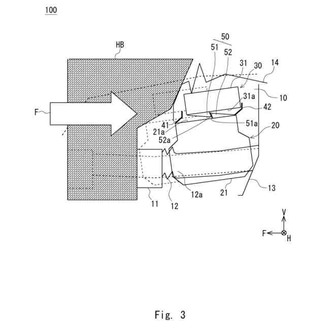 図1に示す車両が前面衝突した時の車両の前部を示す側面図である。