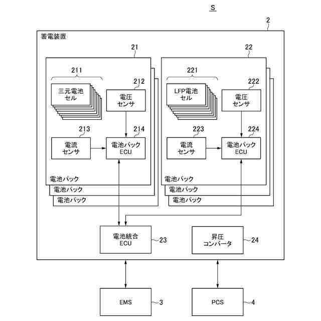 図1を参照しながら本実施形態における蓄電システムSについて説明する。蓄電システムSは、不図示の発電設備(風力発電、太陽光発電などを含む)によって発電された電力を蓄えるシステムである。蓄電システムSは、不図示の系統に対して、蓄えた電力を供給するシステムでもある。蓄電システムSは、蓄電装置2と、EMS(Energy Management System)3と、PCS(Power Conditioning System)4と、を備えている。