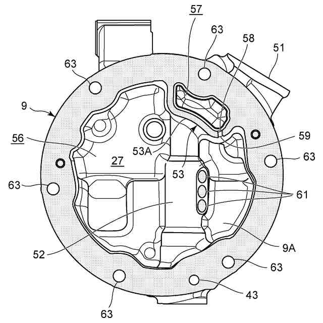 この吐出圧損を低減する方法としては、固定スクロールの吐出孔径を拡大する方法があるが、それでは吐出脈動が大きくなるため、採用することができない。また、特許文献2のようにリアケーシングに取り付けられたオイルセパレータオイル分離パイプに小穴を穿設し、吐出ポートと吐出室を直接連通することで、オイルセパレータを経ること無く、吐出室から作動流体が吐出ポートに至る経路を作る方法もあるが、特許文献2のように別体のオイルセパレータをリアケーシングに取り付けるものでは部品点数が増大すると共に、リアケーシングにオイルセパレータを一体に構成するものでは加工工程が増大する課題があった。