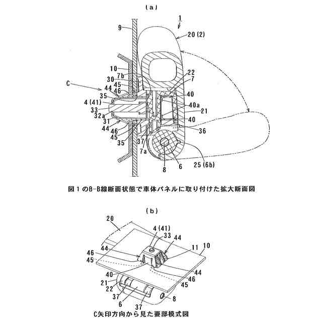 以上のクリップ11は、図10(b)のごとく本体12がアシストグリップ1に取り付けられた後、車体パネルの矩形孔24に対し押操作により係合される。この過程では、クリップ11が矩形孔24に差し込まれて、両側の係止部13が矩形孔24の孔縁に圧接される。また、クリップ11は、パネル23に対し同図のごとく傾斜部18がパネル裏側孔縁に圧接された状態で、落ち込み防止爪21と係止爪19によりパネルを表裏から挟持した状態で取り付けられる。