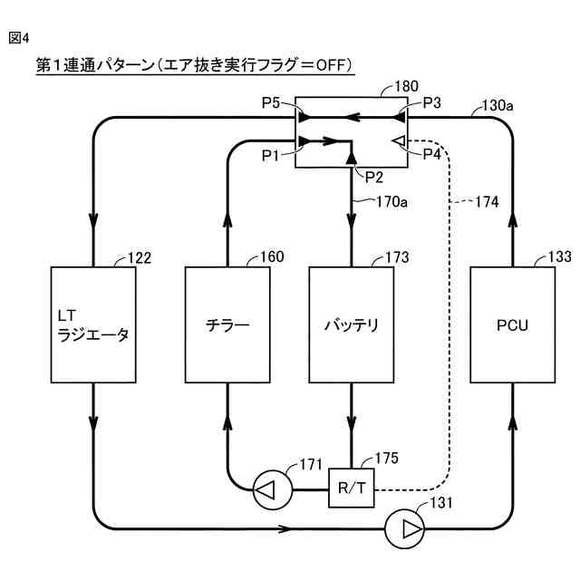 ここで、上記特許文献1には明記されていないが、五方弁の状態を制御することにより、PCUが接続される経路(第1流路)またはバッテリが接続される経路(第2流路)と、リザーブタンクとが接続されない回路が一時的に形成される場合がある。この場合、リバーブタンクと接続されていない経路において気泡が混入(残留)する恐れがある。