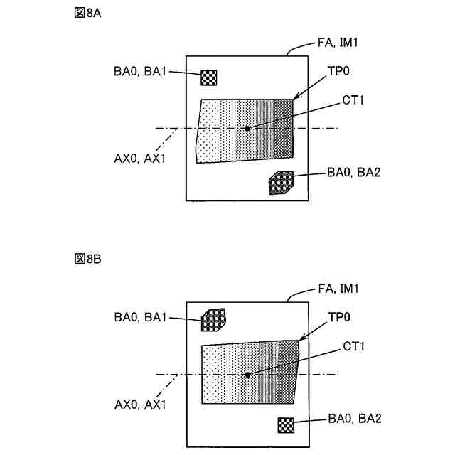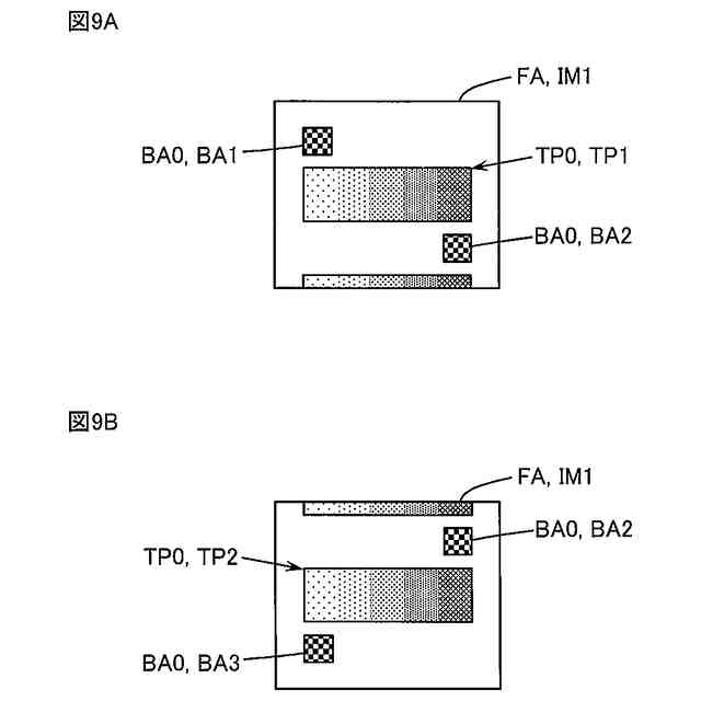図9Aは第一テストパターン、第一ブレ検知領域、及び、第二ブレ検知領域を含む画像の例を模式的に示す図、図9Bは第二テストパターン、第二ブレ検知領域、及び、第三ブレ検知領域を含む画像の例を模式的に示す図。