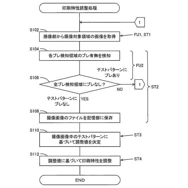 また、本発明のプログラムは、記録ヘッドを備える印刷装置の印刷特性を調整するためのテストパターンを有する媒体を撮像する撮像部から取得される画像に含まれる前記テストパターンのブレを判定するためのプログラムであって、