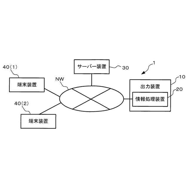 図1は、本開示の一実施形態による情報処理方法を実行する情報システム1の構成例を示す図である。図1に示されるように、情報システム1は、出力装置10と、端末装置40(1)及び端末装置40(2)と、サーバー装置30と、を含む。出力装置10は、情報処理装置20を含む。情報処理装置20、端末装置40(1)、端末装置40(2)、及びサーバー装置30の各々は、例えばインターネット等のネットワークNWに接続される。本実施形態では、セキュリティー確保のため、端末装置40(1)又は端末装置40(2)とサーバー装置30との間の通信、及びサーバー装置30と情報処理装置20との間の通信にはいずれもHTTPS(HyperText Transfer Protocol Secure)に準拠した通信が採用される。具体的には、これらの通信はWebAPI(Web Application Programming Interface)により実現される。