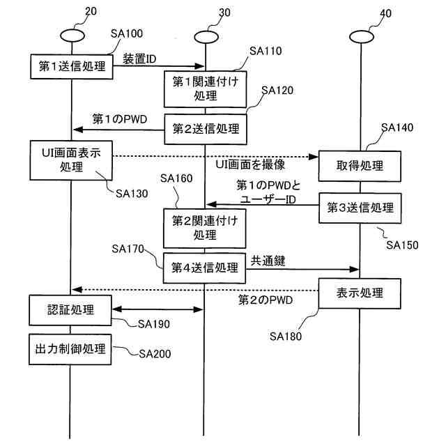 【解決手段】所定のサービスを提供するサーバー装置30は、出力装置10を示す装置IDと第1のパスワードとを関連付ける。サーバー装置30は、第1のパスワードを出力装置10に出力させ、ユーザーIDを用いてログイン済みの端末装置40から第1のパスワードを受信した場合に、出力装置10と端末装置40のユーザーとを関連付ける。サーバー装置30は、共通鍵を端末装置40に送信し、当該共通鍵と所定の暗号化アルゴリズムとに基づく第2のパスワードを端末装置40に出力させる。出力装置10は、第2のパスワードの入力を契機として当該第2のパスワードの生成に用いられた共通鍵に対応するユーザーIDをサーバー装置30から取得し、当該ユーザーIDに基づく処理を実行する。