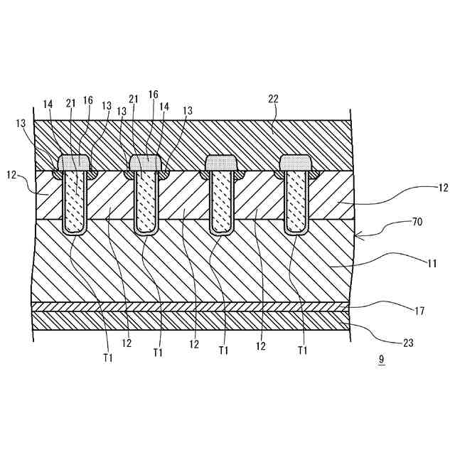 層17にはコレクタ電極23が形成されている。また、全ての溝構造T1中のゲート電極21は図示の範囲外で接続され、制御電圧が印加される。この構造によって、ゲート電極21、エミッタ電極22、コレクタ電極23の電位が与えられることによってIGBTは動作する。図9において溝構造T1は4つのみ記載されているが、実際にはより多くの溝構造T1が同様に多数並行に形成されている。