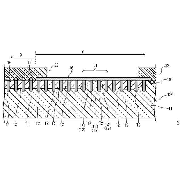 層13)に対応する層は形成されていない。また、終端領域においては、素子領域とは異なり、層間絶縁層16は、複数の溝構造T2間の半導体領域上部も覆うように形成されている。図10において溝構造T2は5つのみが記載されているが、実際にはより多くの溝構造T2が左側の図示の範囲外においても配列されている。