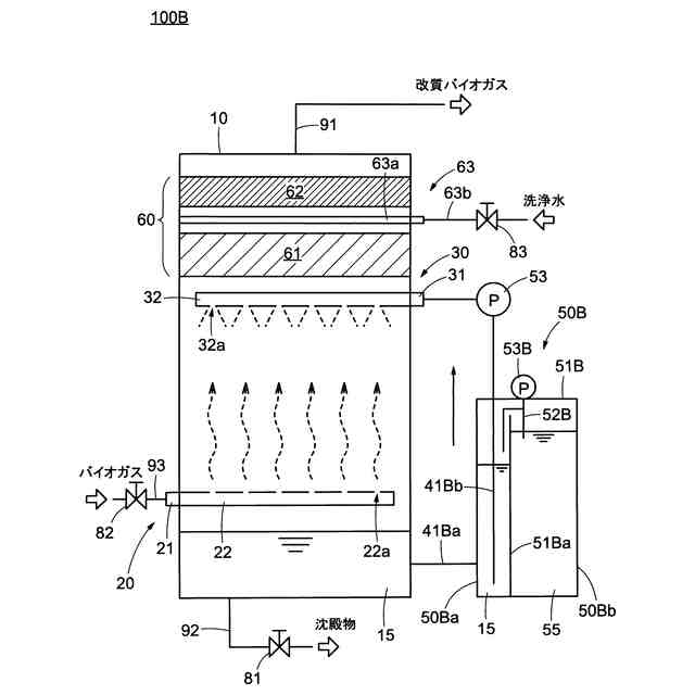 【解決手段】バイオガス改質装置は、装置本体と、前記装置本体の内部にバイオガスを供給するバイオガス供給部と、前記バイオガス供給部より上方に配置され、前記装置本体の内部においてアルカリ反応液を下方に向けて噴射する反応液噴射部と、を備える。バイオガス発生装置は、前記装置本体の底部に貯留した前記アルカリ反応液を前記反応液噴射部に返送する反応液返送部をさらに備えていてもよい。