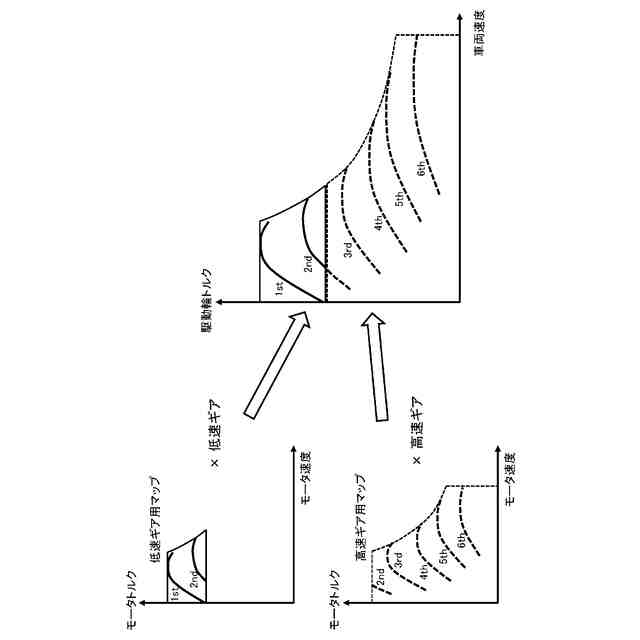 各変速比用のマップでは、当該変速比に関連付けられた1又は複数のシフトポジションにおける前記モータ速度と前記モータトルクとの関係が定義されている