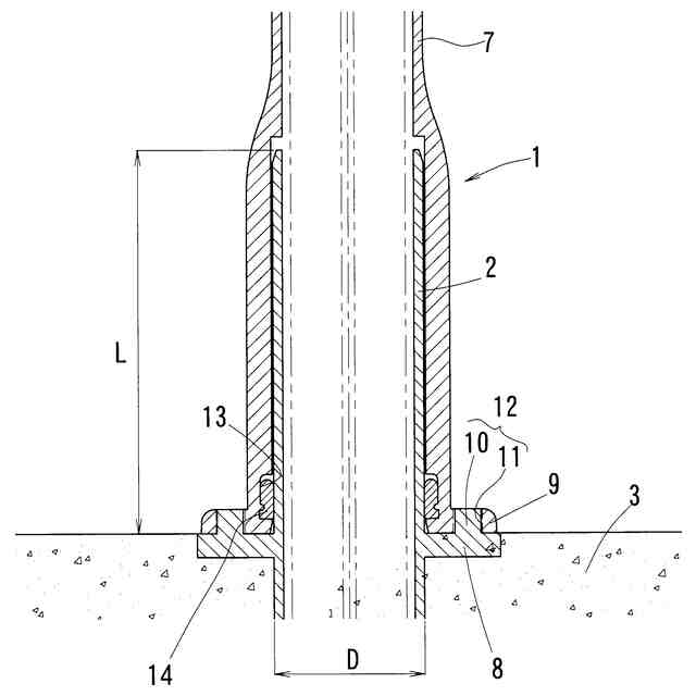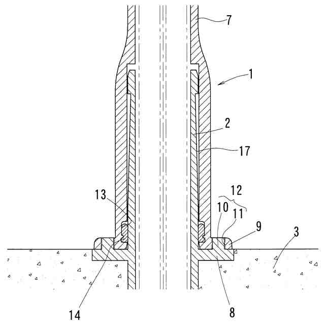 特許文献1に係る構成においては、ボルト22の一端側がコンクリート製の基礎18中、他端側が大気中という異なる環境に曝されていることから、コンクリートマクロセル腐食が発生しやすく、ボルト22の早期交換や腐食対策等が必要となる。また、特許文献2に係る構成においては、屈曲防止リング14の設置に手間を要する問題がある。
