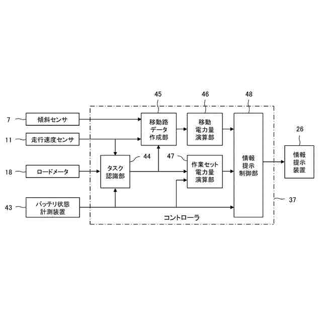 上記目的を達成するために、本発明は、蓄電装置と、前記蓄電装置で蓄えられた電力によって駆動される走行装置及び作業装置と、コントローラと、情報提示装置とを備えた電動式作業機械において、前記コントローラは、前記電動式作業機械が作業場から充電場まで移動するのに要する第1の電力量を演算し、前記電動式作業機械が1つの作業セットを行うのに要する第2の電力量を演算し、前記第1及び第2の電力量と共に、前記蓄電装置で蓄えられた電力量を前記情報提示装置に提示させる。