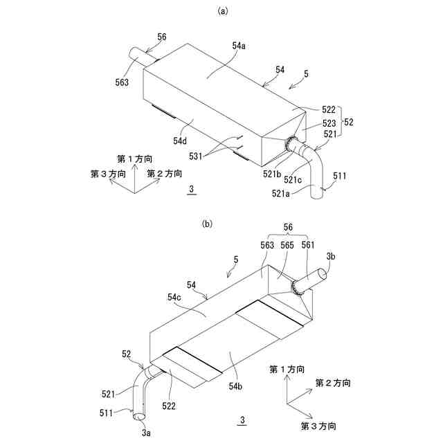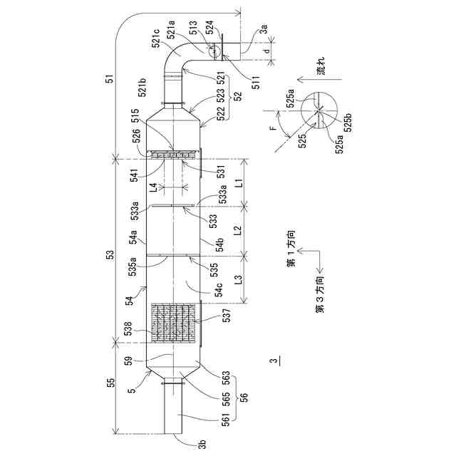 第2領域53には、還元剤を吐出するための第2吐出部531と、第2吐出部531に対して流出口3b側に配された第1板部533と、第1板部533に対して流出口3b側に配された第2板部535と、第2板部535に対して流出口3b側に配された第2触媒部537とが設けられている。