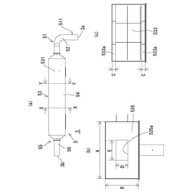 (a)は脱硝装置を第1方向から見た図であり、(b)は図4(a)のX-X断面を矢印方向から見た断面図であり(c)は図4(a)のY-Y断面を矢印方向から見た断面図である。