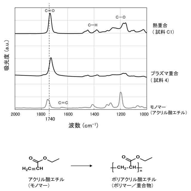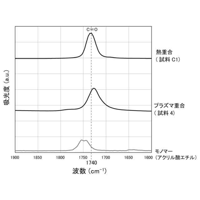 (2)本発明のアクリル酸プラズマ重合膜(単に「プラズマ重合膜」ともいう。)は、アクリル酸系モノマー(単に「モノマー」ともいう。)を熱重合させて成膜した従来の膜(「熱重合膜」という。)とは異なる成分組成または分子構造を有する。
