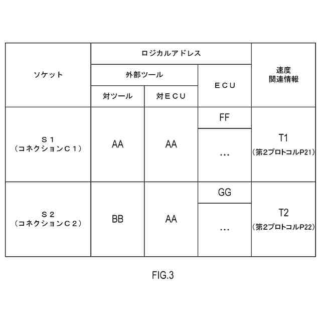 【解決手段】プロトコル変換部22は、外部ツール4との通信に用いる第1プロトコルと、ECU3A,3Bとの通信に用いる第2プロトコルとの変換を相互に行う。アドレス変換部23は、変換テーブル231に従って、対ツールアドレスと対ECUアドレスとを相互に変換する。1つの外部ツール4には、複数の対ツールアドレスが割り当てられる。変換テーブル231は、速度関連情報によって識別される第2プロトコルの種類毎に、異なる対ツールアドレスが紐づけられるように設定される。