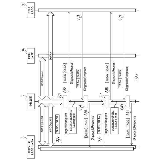 車載システムでは、外部ツールと中継装置との接続にイーサネットが用いられ、診断対象となる複数のECUと中継装置との接続に、イーサネットとCANとが混在する場合がある。イーサネット及びCANは登録商標である。イーサネットにおけるダイアグ通信は、例えばDoIPが知られており、CANにおけるダイアグ通信は、例えばDoCANが知られている。DoIPでは1フレームで送信できる長さのデータであっても、DoCANでは複数フレームに分割して送信する必要がある。