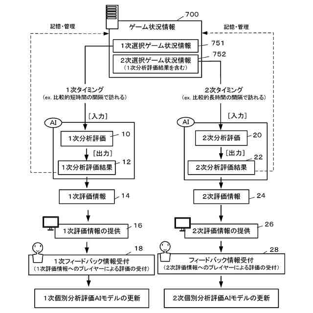 プレイヤーがゲームプレイを行ったゲーム状況情報を前記分析評価手段に分析評価させ、当該分析評価結果に基づく評価情報を前記プレイヤーに提供する制御を行う評価情報提供制御手段(例えば、図2の1次評価情報の提供16、2次評価情報の提供26、図10の評価情報提供制御部240、図13のステップS96、図14のステップS122)と、
