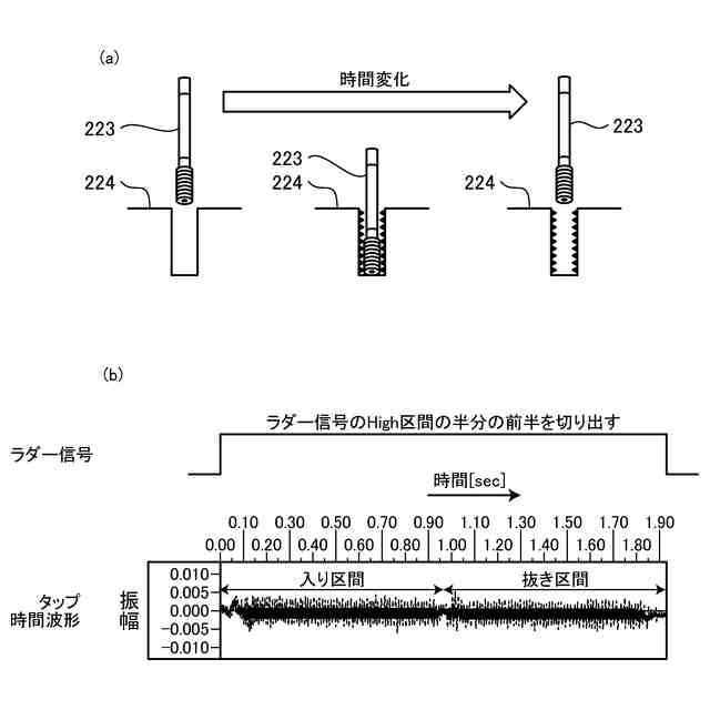 図11は、加工装置の加工工具の状態の判定の一例を示す図であり、図11(a)はタップ加工処理の時間変化を示す図、図11(b)は図11(a)のタップ加工処理にかかるラダー信号および時間波形を示す図である。
