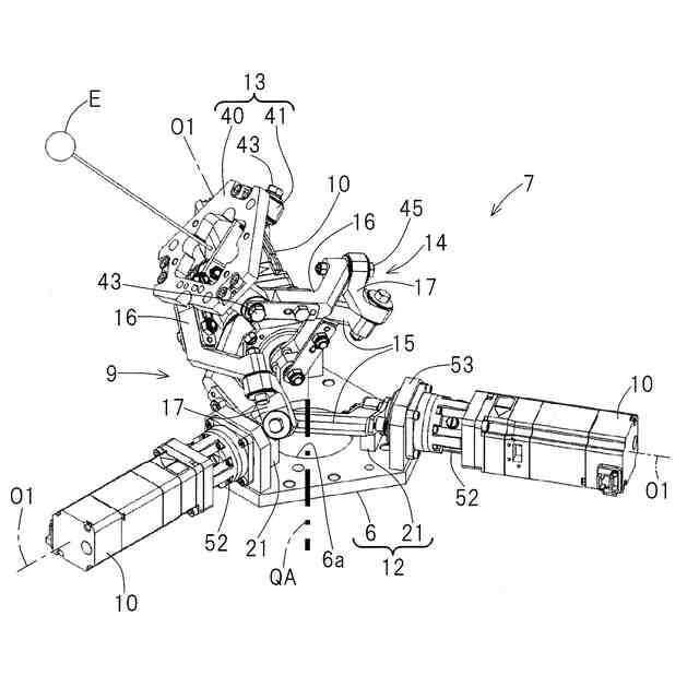 特許文献1の図1に示す装置では、互いに直交するX軸、Y軸、Z軸の直交3軸方向にヘッド部を移動させる機構、および前記ヘッド部の先端に回転機構を介して作業体が取り付けられた技術等が開示されている。