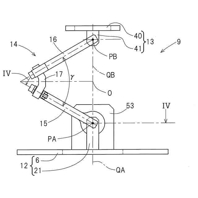 前記回転機構部における、前記回転軸が移動する場合の回転軸の延長線上で形成される仮想平面または前記回転軸が移動しない場合の回転軸と、前記角度制御機構部における、前記基端側中心軸が移動する場合の回転軸の延長線上で形成される仮想平面または前記基端側中心軸が移動しない場合の基端側中心軸と、が平行または同一平面上にあってもよい。