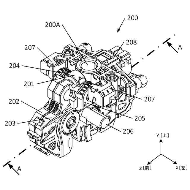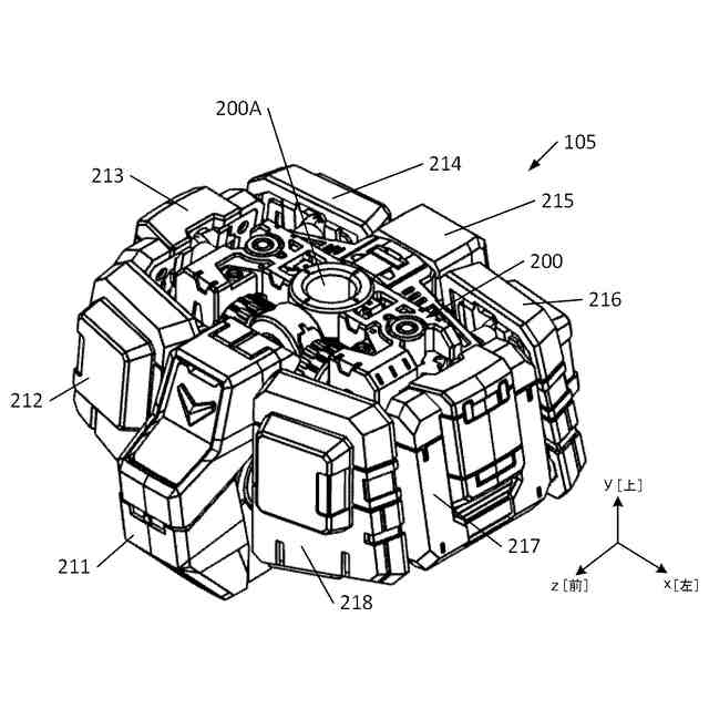 まず図1を参照して、本実施形態に係る模型玩具100の外観構成の一例について説明する。図1(A)は模型玩具100の外観正面を示し、図1(B)は模型玩具100の外観側面を示す。なお、x,y,zの矢印はそれぞれ模型玩具における上、左、前方向の向きを示し、他の図面についても同様である。
