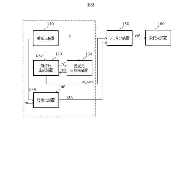 【課題】プロキシ再暗号化等において、委託元での秘密鍵の管理を不要とする。