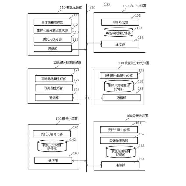 【解決手段】第1の生体情報を取得して第1の生体利用分散鍵を生成する委託元装置と、前記委託元装置から前記第1の生体利用分散鍵を受け取り記憶部に記憶する委託元分散先装置と、第2の生体情報を取得して第2の生体利用分散鍵を生成し前記委託元分散先装置に送信する鍵分散生成装置と、を備え、前記委託元分散先装置は、前記第1の生体利用分散鍵と前記第2の生体利用分散鍵の差分から、委託先の公開鍵を用いて、鍵利用分散鍵を生成して前記鍵分散生成装置に送信し、前記鍵分散生成装置は、前記鍵利用分散鍵とから再暗号化鍵を生成する。