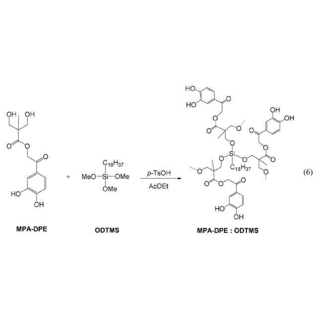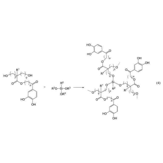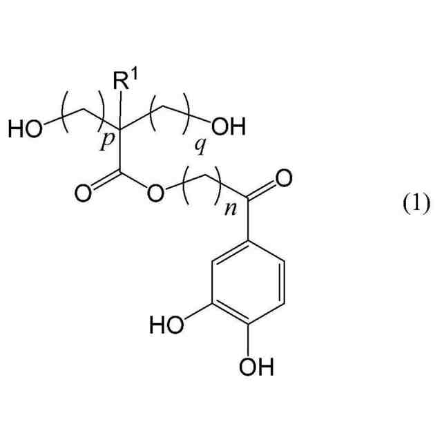 最近では、生物模倣(バイオミメティクス)の観点で発明された接着剤が着目され、例えば、ムール貝の接着性タンパク質を模倣したカテコール基含有接着剤が開発されている。ムール貝の接着性タンパク質は、L-3,4-ジヒドロキシフェニルアラニンの基本骨格であるカテコール基を有するポリフェノールから構成されている。その生物模倣物であるドーパミンとその化合物は、その接着性タンパク質の化学構造を単純化した材料である。ドーパミンから形成される、ポリドーパミンは、様々な被着体に接着可能であり、金属、セラミックスの他、従来の接着方法では接着困難な被着体であるフッ素系樹脂およびポリオレフィンに対しても接着する性質が報告されている(非特許文献1)。この事例では、カテコール基を含有する組成物が、プラズマ処理等の物理的な酸化処理を行うことなく、溶液でのディップコートのみで様々な被着体に対し、接着性を示すことが示されている。