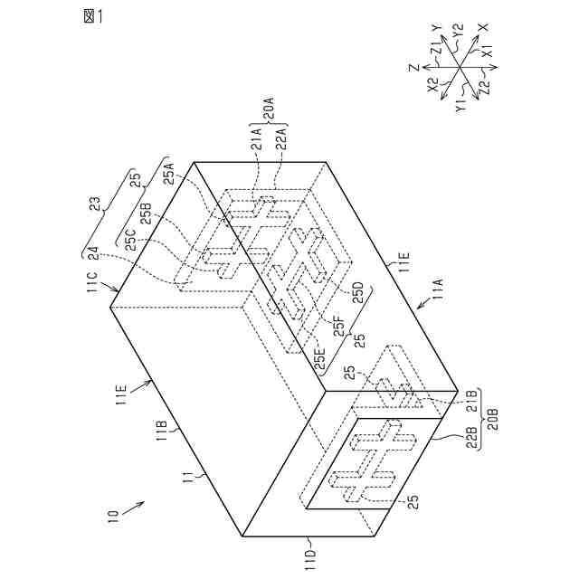 図面において図示は省略しているが、素体11は、全体として複数の板状の層が積層された構造となっている。これらの層は、平面視で略長方形状である。図1に示すように、素体11は、略直方体状である。そのため、素体11が有する外面の外縁形状は、平面視においていずれも矩形状である。これら外面のうち、特定の方向を向く面を実装面11Aとする。そして、当該実装面11Aに平行な面を天面11Bとする。実装面11Aに垂直な外面のうち、特定の面を第1端面11Cとする。当該第1端面11Cに平行な面を第2端面11Dとする。また、実装面11A及び第1端面11Cのいずれにも垂直な2つの外面を側面11Eとする。
