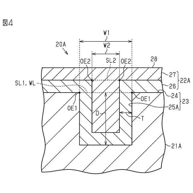 前記第1層の前記凹部を覆う部分の外表面は、前記第1層の前記平坦面を覆う部分の外表面に対して窪んでおり、