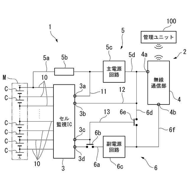 前記セル監視部と前記無線通信部との間で電力変換を行う副電源回路と、