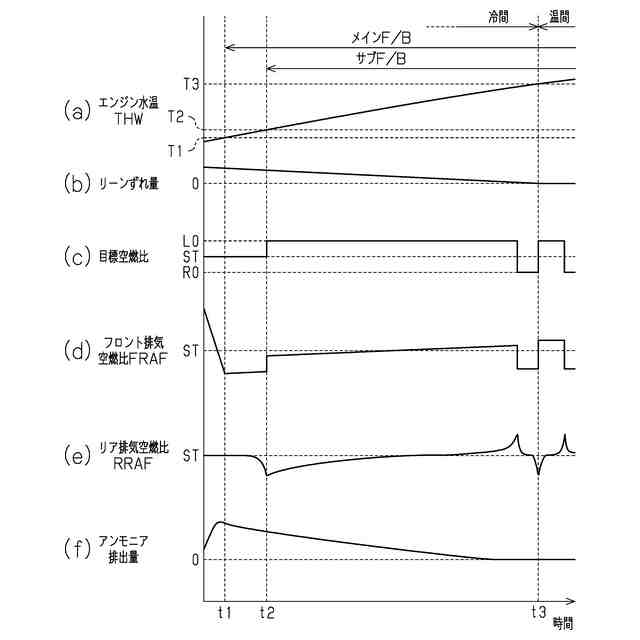 冷間運転時のリーン側目標空燃比のリーン補正を行わない場合の、(a)はエンジン水温の推移を、(b)はリーンずれ量の推移を、(c)はメインフィードバックの目標空燃比の推移を、(d)はフロント排気空燃比の推移を、(e)はリア排気空燃比の推移を、(f)はアンモニア排出量の推移を、それぞれ示すタイムチャートである。