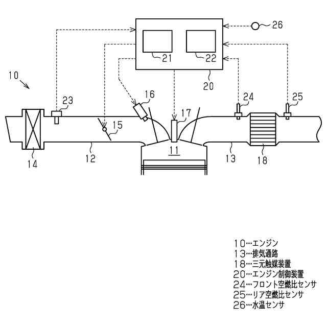 エンジン10は、エンジン制御装置20により制御されている。エンジン制御装置20は、エンジン制御用の電子制御モジュールである。エンジン制御装置20は、演算処理装置21と記憶装置22とを備えている。記憶装置22には、エンジン制御用のプログラムやデータが予め記憶されている。エンジン制御装置20は、記憶装置22に記憶されたプログラムを演算処理装置21が読み込んで実行することで、エンジン制御に係る各種の処理を実行する。エンジン制御装置20には、エンジン10の運転状況を検出するための各種センサの検出信号が入力されている。そうしたセンサには、エアフローメータ23、フロント空燃比センサ24、リア空燃比センサ25、及び水温センサ26が含まれる。エアフローメータ23は、吸気通路12を流れる吸気の流量である吸入空気量GAを検出するセンサである。フロント空燃比センサ24は、排気通路13における三元触媒装置18よりも上流側の部分に設置された空燃比センサである。リア空燃比センサ25は、排気通路13における三元触媒装置18よりも下流側の部分に設置された空燃比センサである。水温センサ26は、エンジン10の冷却水の温度であるエンジン水温THWを検出するセンサである。以下の説明では、フロント空燃比センサ24の空燃比検出値をフロント排気空燃比FRAF、リア空燃比センサ25の空燃比検出値をリア排気空燃比RRAFと記載する。更に、燃焼室11で燃焼される混合気の空燃比を燃焼空燃比と記載する。