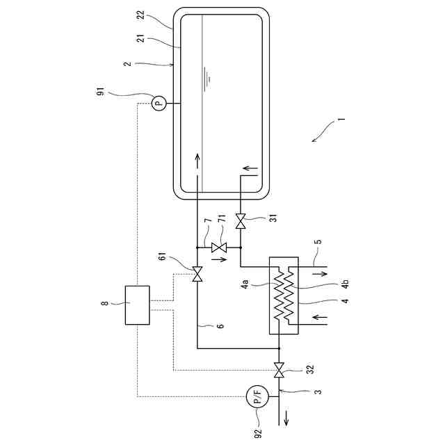例えば、特許文献1には、図4に示すようなガス燃料供給システム100が開示されている。具体的に、ガス燃料供給システム100は、液化ガスを貯留するタンク110と、タンク110から液化ガスを導出する燃料供給ライン120と、燃料供給ライン120に設けられた蒸発器130を含む。