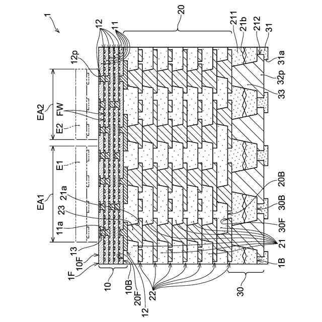第1ビルドアップ部10は比較的微細な配線を含んでおり、比較的密度の高い回路配線を有し得る。図1の例では、第1ビルドアップ部10は、交互に積層される絶縁層(第1絶縁層)11と導体層(第1導体層)12とを有している。一層の第1絶縁層11を挟んで対向する導体層12同士はビア導体(第1ビア導体)13によって接続されている。第1導体層12は、所定の導体パターンを有するようにパターニングされている。第1ビルドアップ部10の第1面10Fは、第1導体層12の表面(上面)および導体層12のパターンから露出する第1絶縁層11の表面(上面)によって構成されている。図示の例では、第1面10Fを構成する導体層12は複数の導体パッド12pを有するパターンに形成されている。