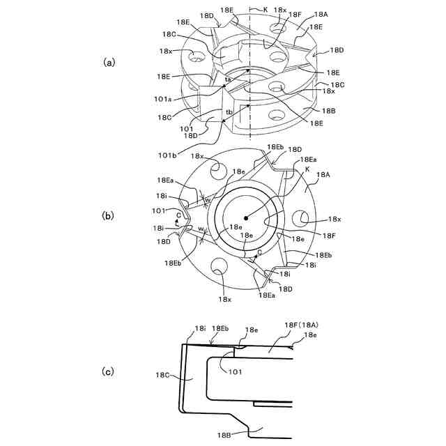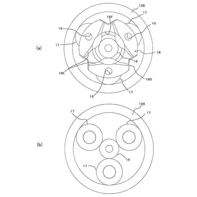 第一段遊星歯車機構のキャリア付近の概略構造を表す図3中D方向から見た模式上面図、及び、図4(a)の構成からキャリアを省略した模式上面図である。