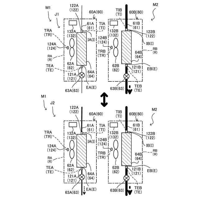前記膨張弁(63)は、前記第1放熱器(64A)に対応する第1膨張弁(63A)と、前記第2放熱器(64B)に対応する第2膨張弁(63B)と、を含み、