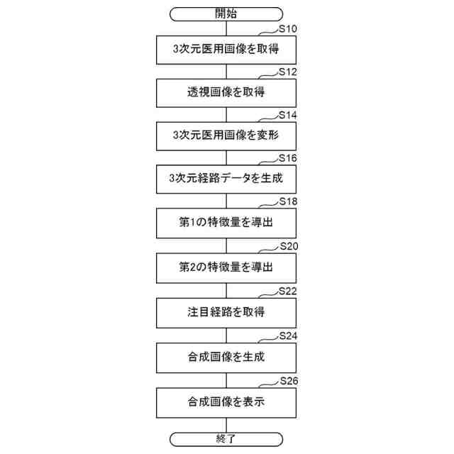 前記3次元経路を前記2次元医用画像へ重畳させた合成画像を表示する制御を行い、かつ前記合成画像において前記第1の特徴量に応じて前記3次元経路の表示態様を異ならせる