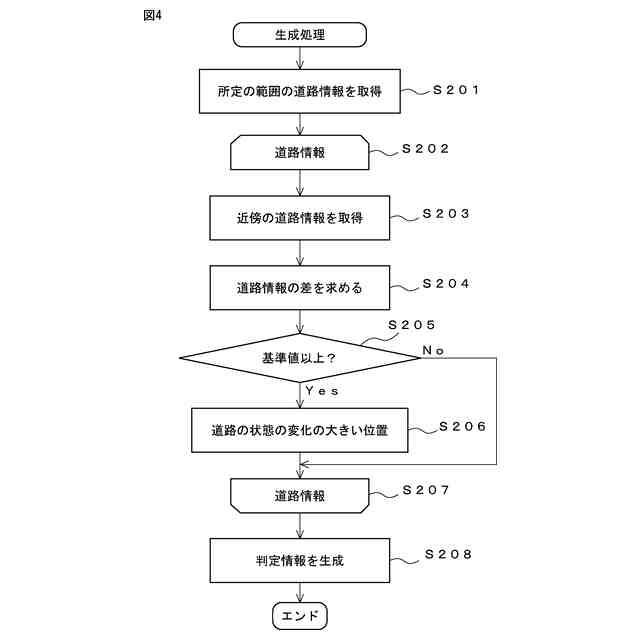 前記道路情報が表す位置と、前記道路情報が表す位置の近傍との間で、道路の状態の変化の大きい位置を表す前記判定情報を生成する生成部を、更に有し、
